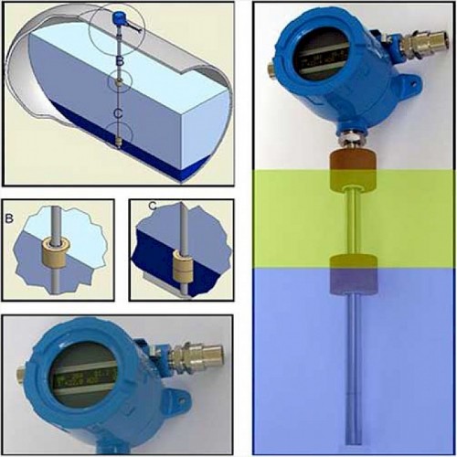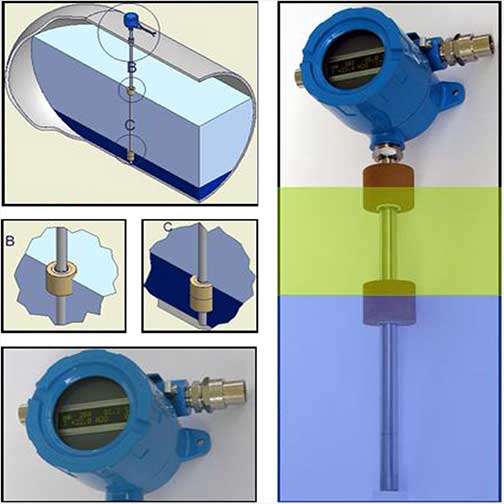 The following is the operating principle; inside the probe tube there is a rigid wire made of magnetostrictive material. The sensor circuitry emits pulses of current through the wire, generating a circular magnetic field. The level transmitter is a magnet, which is integrated into the float. Its magnetic field magnetizes the wire axially. Since the two magnetic fields are superimposed, around the float magnet a torsion wave is generated which runs in both directions along the wire. One wave runs directly to the probe head while the other is reflected at the bottom of the probe tube. The time is measured between emission of the current pulse and arrival of the wave at the probe head. The position of the float is determined on the basis of the transit times.