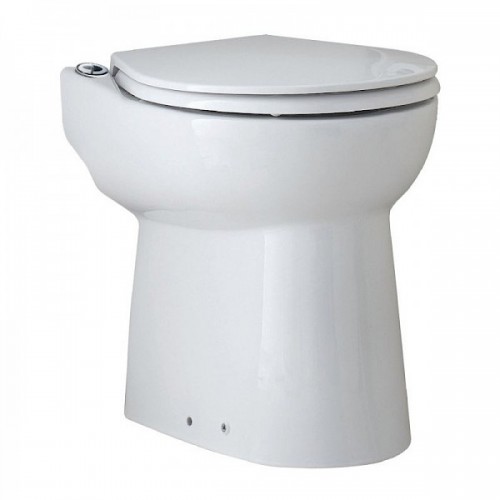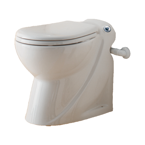 Тоалетна чиния с вградена помпа с режещ механизъм. Не се нуждае от тоалетно казанче, тъй като системата за изпускане на водата е вградена. Вертикално изпомпване: 3 метра.