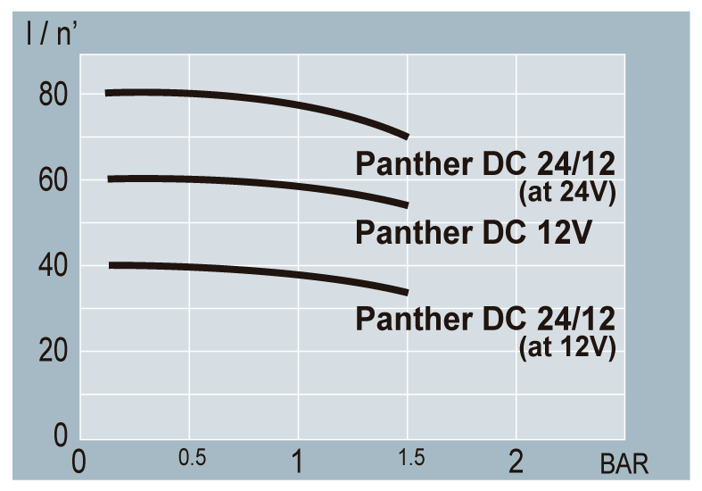 Серия PANTHER DC - самозасмукващи пластинчати помпи с висок дебит, лесни за работа и монтаж. Помпите са с вграден бай-пас и смукателен филтър; с механично уплътнение, което гарантира благонадеждност дори при ниски температури. Версията 24V/12V може да се използва с двете напрежения. Компактни, сигурни и надеждни, помпите PANTHER могат да се използват за мобилни машини, превозни средства и стационарни инсталации в случай, че има захранване само от акумулатори.