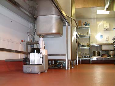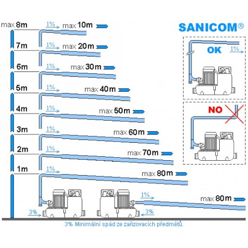 Sanicom е помпена станция от професионален клас. Високодебитната помпа и устойчивостта ú на висока температура, правят системата Sanicom приложима за високо натоварени обекти като ресторанти, барове, кафенета, обществени перални и др. Ако към системата се подвързва душ кабина, нивото на душ коритото трябва да бъде с 15 см над нивото на пода.