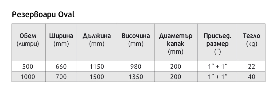 Овални резервоари с обем 500 и 1000 литра. Предназначени са главно за съхранение на питейна вода. Други приложения: съхранение на дъждовна вода, вода за напояване или хранителни течности (масло, мляко). Резервоари Oval са за надземен монтаж, при атмосферно налягане и температури на течностите в диапазона от 4 до 45°С.