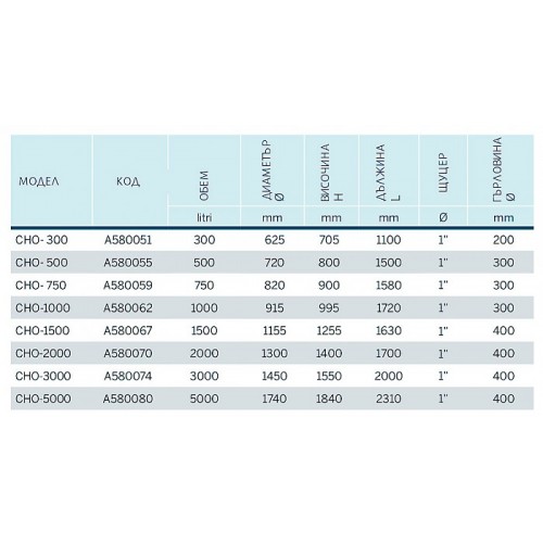 Хоризонтални резервоари за питейна вода. Изработени са от полиетилен. Предлагат се в модели с обем от 300 до 5000 литра. Оборудвани са с един месингов накрайник с външна резба 1".