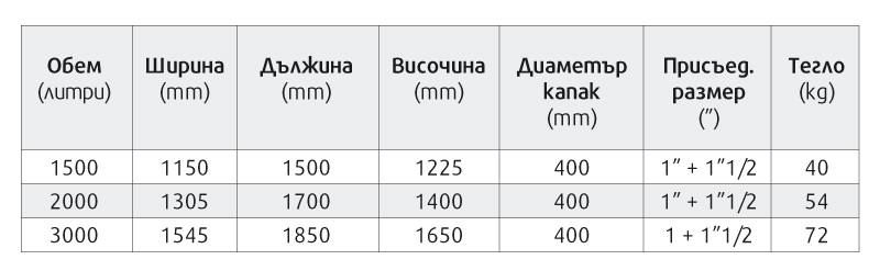 Хоризонтални резервоари за питейна вода от полиетилен. Предлагат се с обем от 1500 до 3000 литра. Присъединителни размери 1" и 1"1/2 с вътрешна резба.